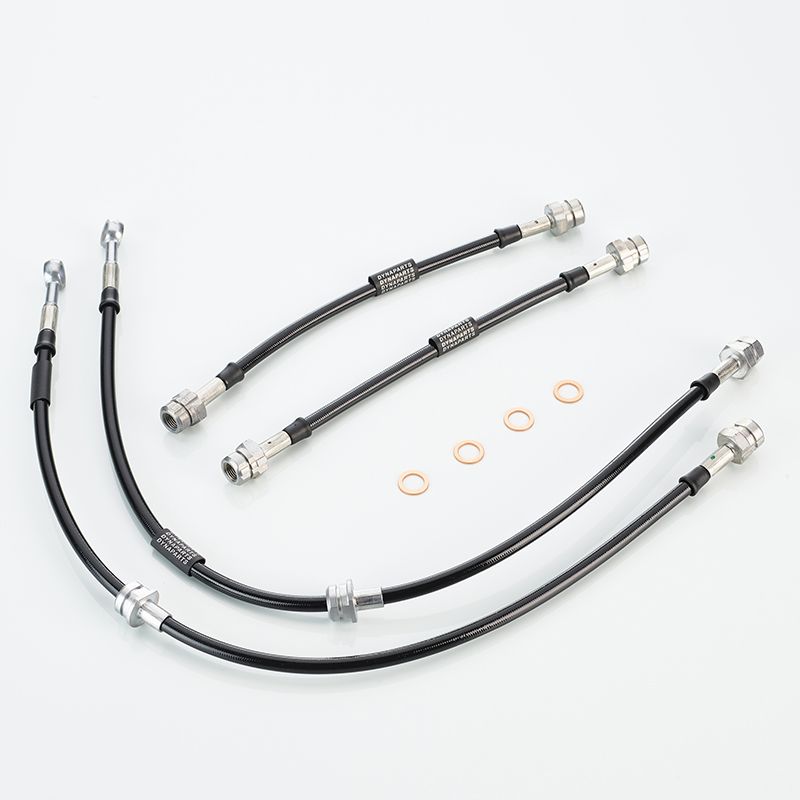 This kit features braided steel brake hoses with a black sheath and Dynaparts branding.