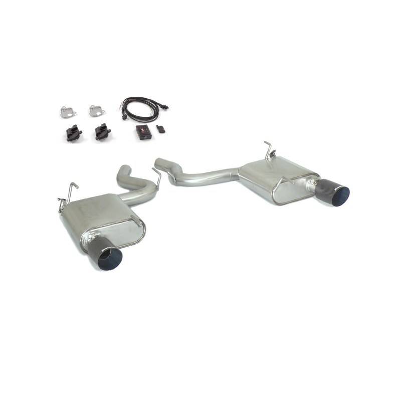 Stainless steel duplex rear silencer with round release Carbon Racing 102 mm with integrated electric valves and wifi remote control. Line with diameter 70 mm